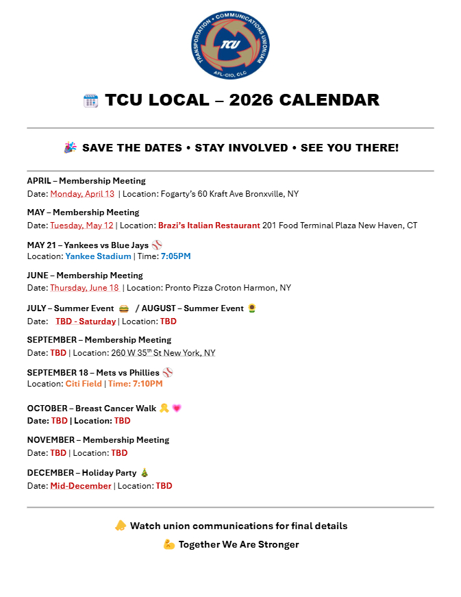 or by mail to TCU Offices at 260 W 35th Street, 10th Floor, New York, NY 10001